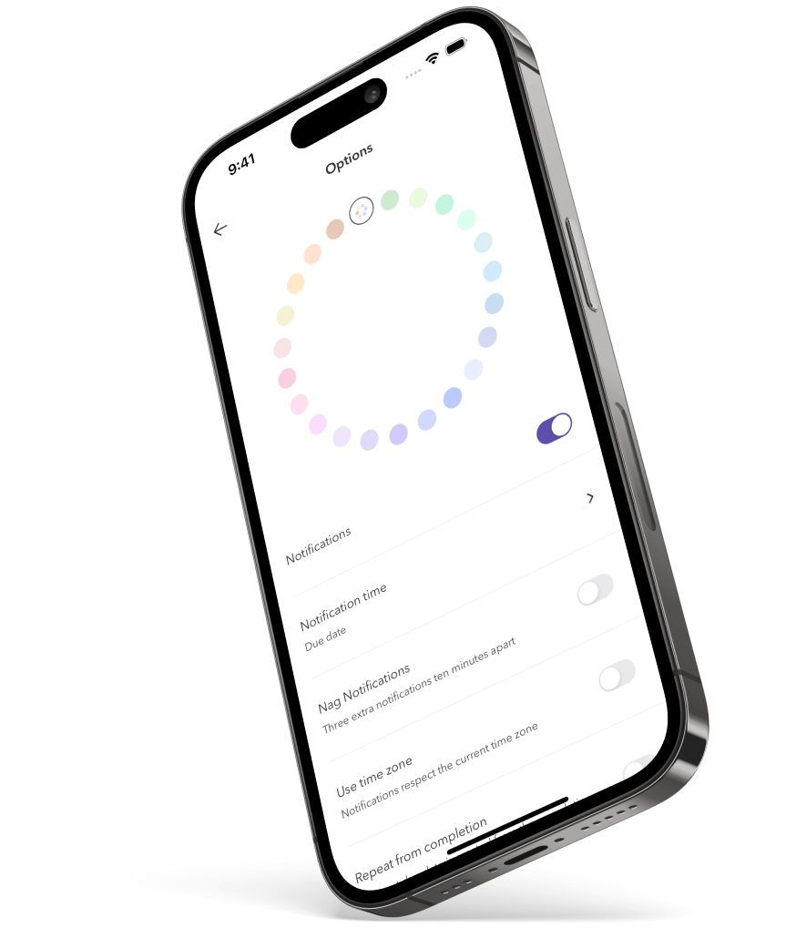 Manage reminder notifications at the task level. Turn off notifications for date-based tasks, enable time zones, and repeat tasks from their completion date.